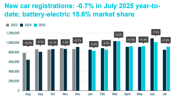 在当月,欧盟新能源汽车商场其实呈现了较为露出的复苏迹象。纯电动汽车、夹杂能源汽车和插电式夹杂能源汽车的注册量分别增长了39.1%、56.9%和14.3%,共计占欧盟汽车注册量的59.8%,高于2024年7月的51.1%。